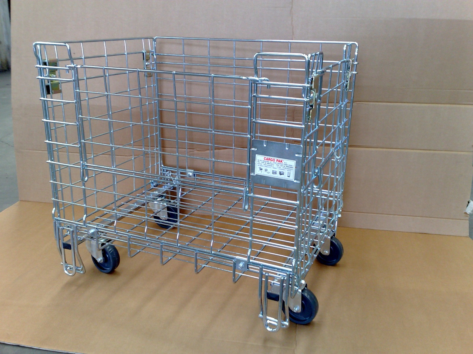 Sono dotati di antello anteriore apribile a ribalta (lato 1190) per facilitare le operazioni di carico e da scarico merci , idoneo all’esposizione dei prodotti (la rete metallica consente una buona visibilità del prodotto) nei settori tessile, logistico e per lo stoccaggio dei prodotti ortofrutticoli e alimentari.