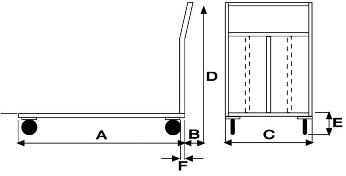 4 ruote (2 fisse-2 girevoli) in gomma piena, 2 con freno Ø 140